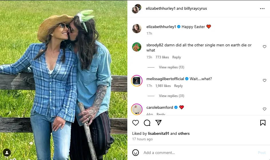 The photo? Straight outta Notebook meets Achy Breaky Heart vibes. The duo posed on a farm (classic Cyrus move), wrapped in coordinating pastel ‘fits — because nothing says “we’re a couple” like matching spring colors and a strategically filtered kiss. Liz kept it simple in the caption: “Happy Easter ♥️” — and dropped Elton John’s I’m Still Standing in the background, which is kinda iconic considering both of them have had, let’s say… eventful love lives.